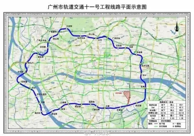 地铁十一号线起于新滘东路,穿越广州市主城区,串联广州市天河区、白云区、越秀区、荔湾区和海珠区,线路呈一条环线,全长43.2千米,共设置32座地下车站。其中白云区段涉及3站点,分别为梓元岗站、广园新村站、大金钟站。