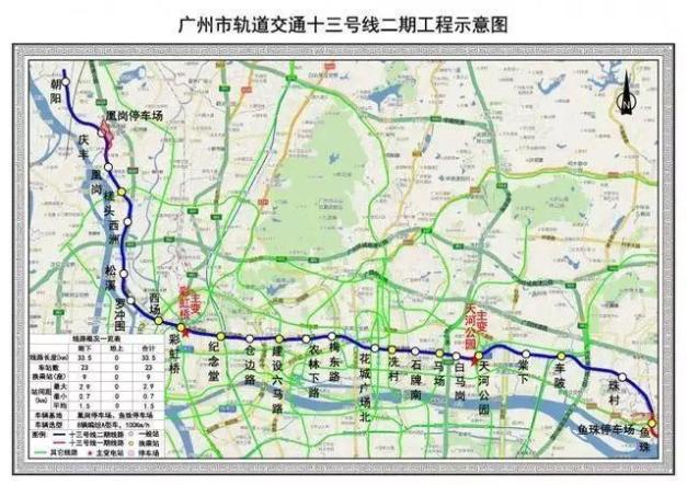 地铁十三号线二期呈东西走向,起于朝阳,终止于首期工程鱼珠站,线路总长约33.5公里,共设23座车站。其中白云区段长约8.3公里,设有7个车站,包括朝阳站、庆丰站、凰岗站、槎头站、西洲站、松溪站、罗冲围站及凰岗停车场。
