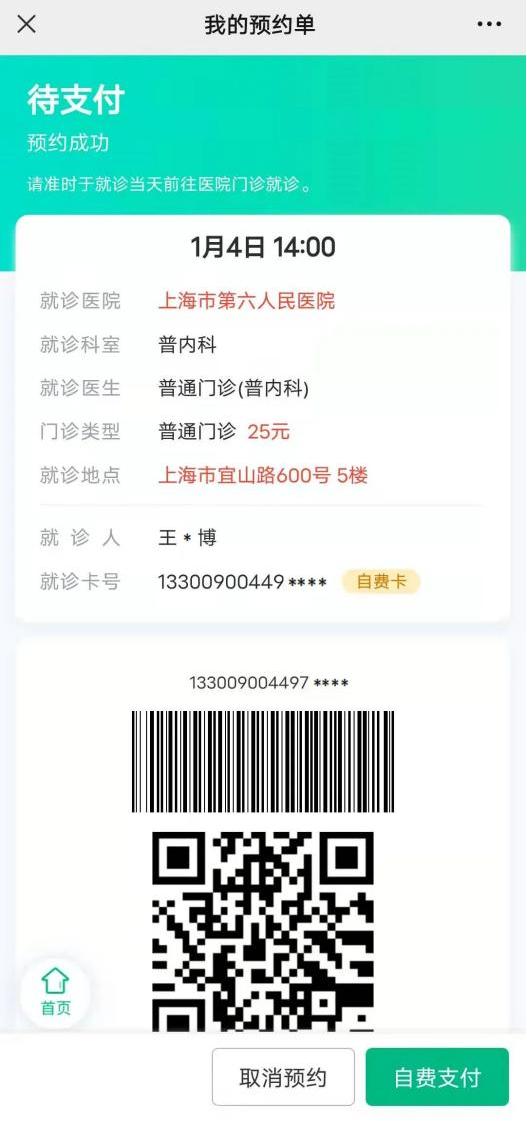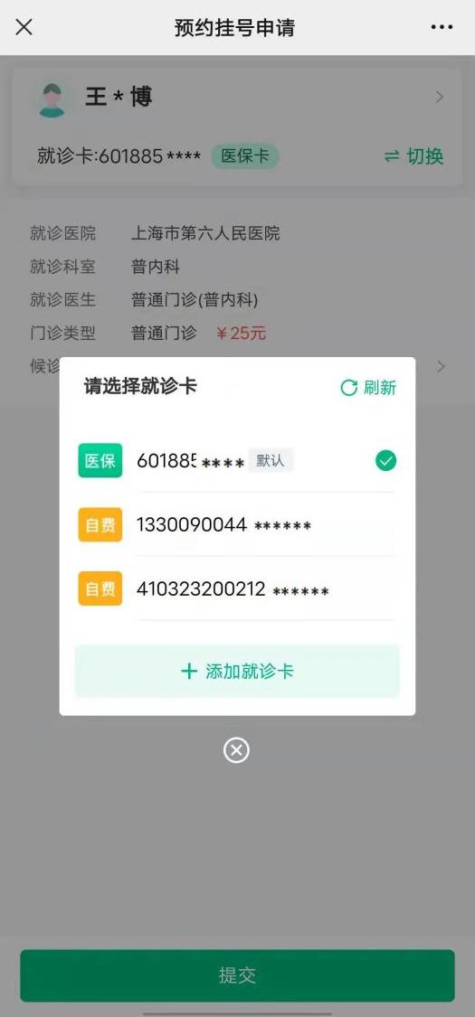 第六步:选择就诊人/卡,确定后提交预约挂号申请。完成预约单支付后,按照约定时间前往医院就诊即可;