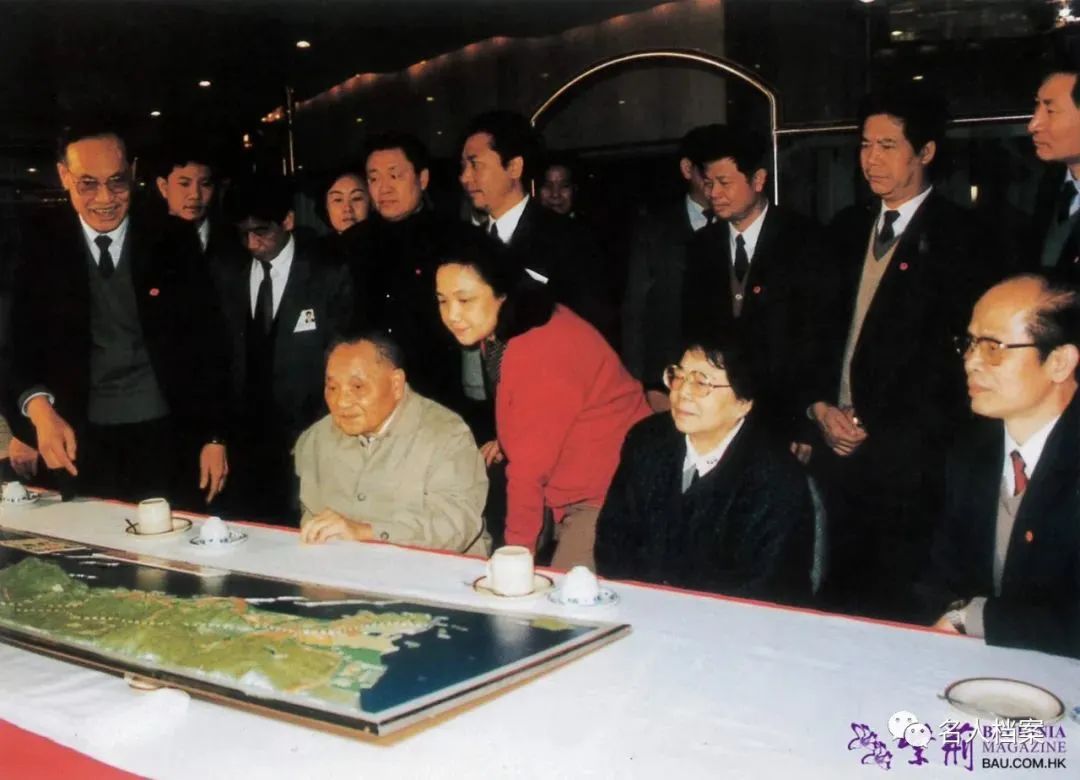 邓小平在深圳、珠海和珠江三角洲一些县市进行了为期11天的考察,图为邓小平于深圳同广东省和深圳市的领导人在一起。(《紫荆》杂志)
