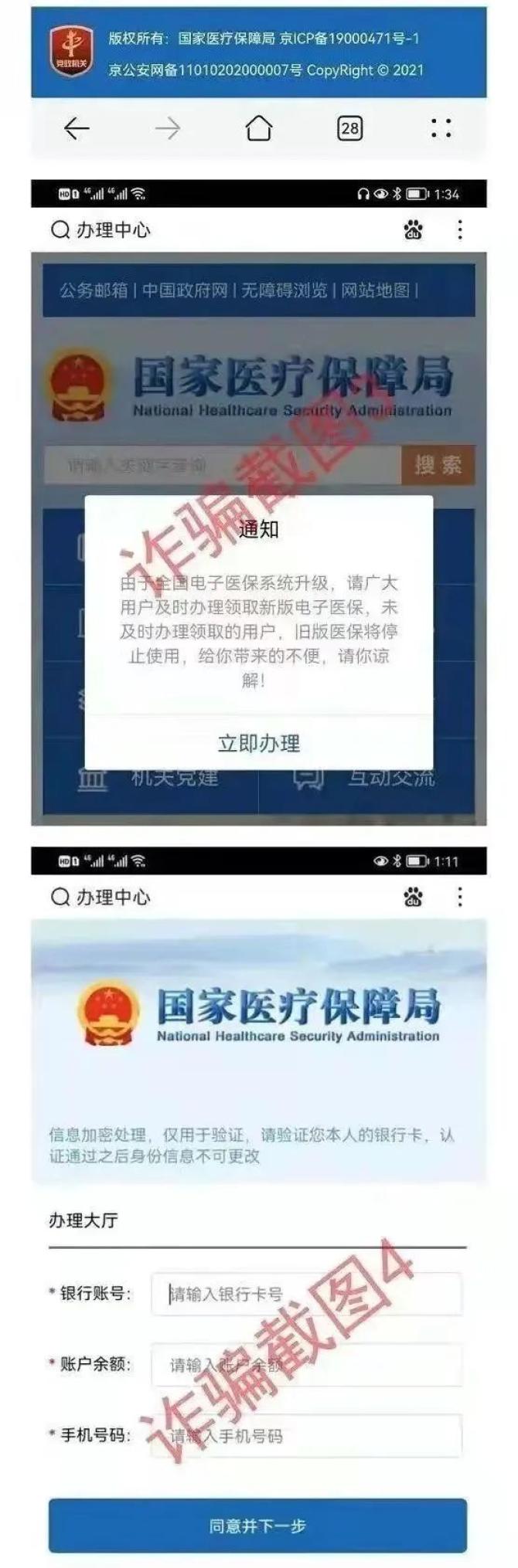 点开链接后,跳转的页面与官方网页非常相似,但内含木马病毒链接,如果按页面上的提示,填写身份证号、银行卡号等信息,则可能导致银行卡被盗刷。