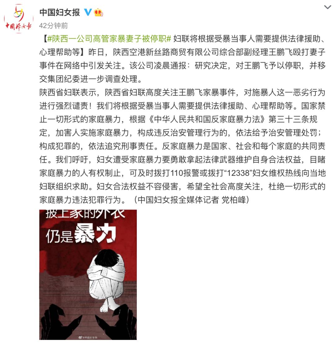 今天下午,陕西省妇联表示高度关注王某飞家暴事件,对施暴人这一恶劣行为进行强烈谴责!并表示将根据受暴当事人需要提供法律援助、心理帮助等。