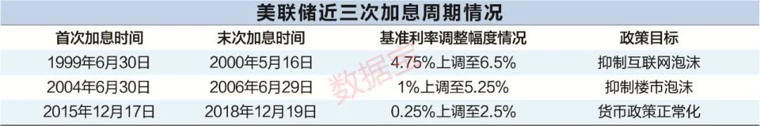 20世纪以来,美联储总共经历了三次加息周期。第一次加息周期为1996年6月至2000年5月,加息背景主要是抑制互联网泡沫,基准利率从4.75%上调至6.5%。第二次加息周期为2004年6月至2006年6月,基准利率从从1%上调至5.25%,加息背景主要是针对当时的房地产泡沫。第三次加息周期为2015年12月至2018年12月,基准利率从0.25%上调至2.5%,加息背景主要是货币政策正常化。