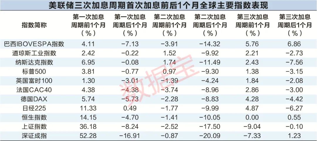 数据宝统计,第一次美联储加息周期,即从1996年6月至2000年5月,全球主要股指平均涨幅接近15%;第二次加息周期内,全球主要股指平均涨幅接近43%;第三次加息周期内,全球主要股指平均涨幅接近17%。