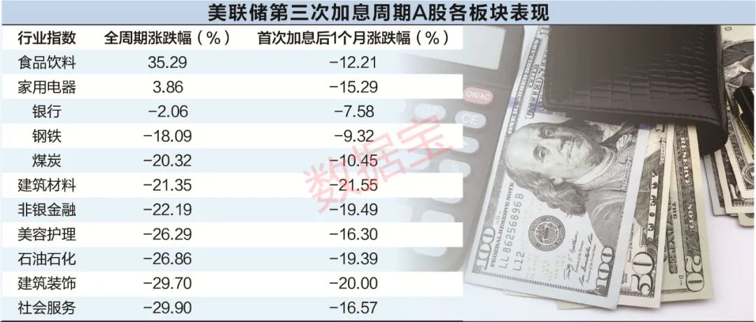 在第三轮加息周期中,A股的价值板块表现也显著较强。其中,第三次周期中首次加息后1个月,银行、钢铁、煤炭等价值板块最为抗跌。在整个加息周期中,食品饮料、家用电器两大消费板块逆市上涨,银行、钢铁、煤炭等板块表现最抗跌。成长板块表现较差,传媒、环保、计算机等板块跌幅居前。