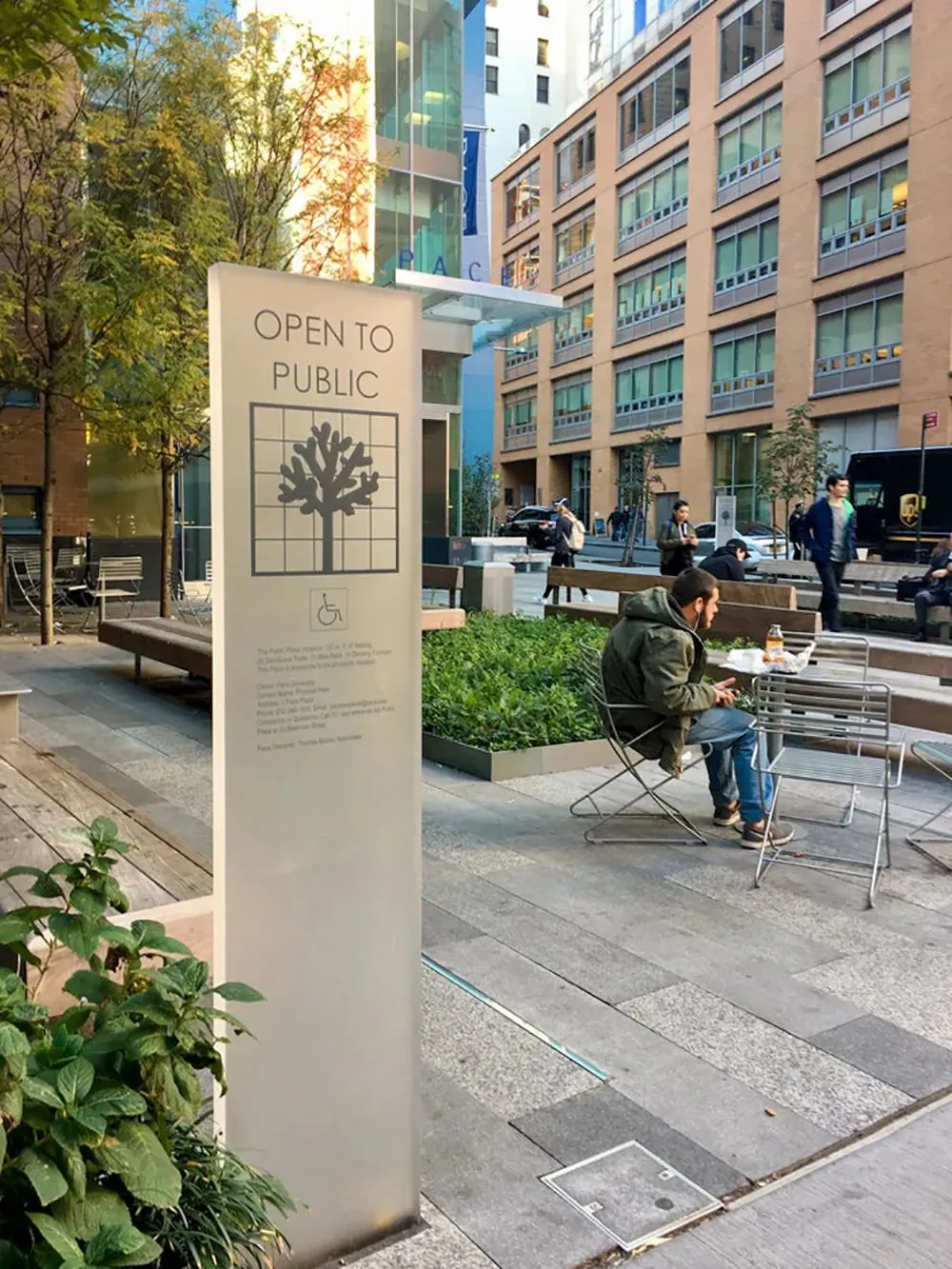 如纽约最新的区划条例修编规定,私人业主必须按照规定设立信息标牌,以保证公众对该处空间进行监督。