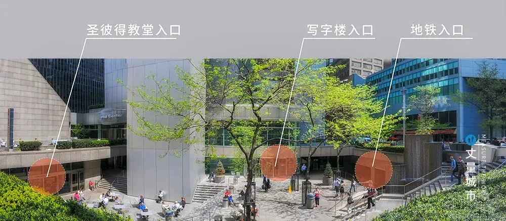 广场也是区域的交通枢纽:南侧与地铁站连通,北侧是圣彼得教堂的地下入口,东侧是花旗集团中心大楼入口,而西侧是一家便利店。