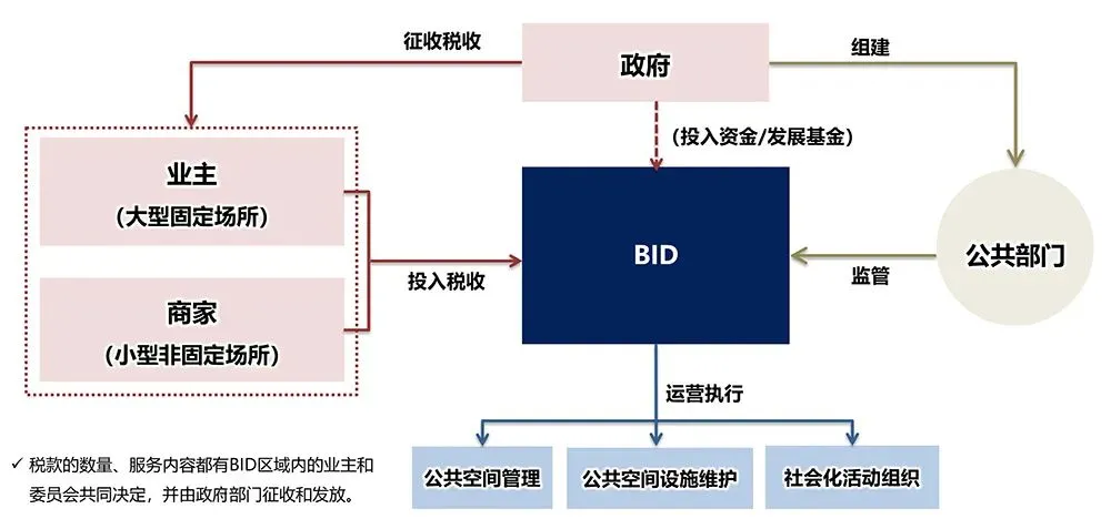 英国BID模式由非营利组织运营,运行资金主要来自政府的税收、拨款等,组织成员则由业主、企业、政府官员组成。