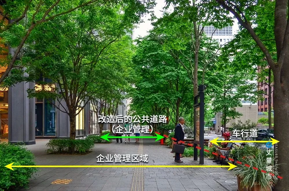 如在丸之内仲大街的步行道加宽改造中,被压缩的车行道所有权属于千代田区,被加宽后的步行空间划拨给企业管理使用。虽然道路的使用未发生实际变化,但扩大增量所带来的景观营造、休憩设施管理、底层商业的运营等,赋予了商务区对大众的吸引力。
