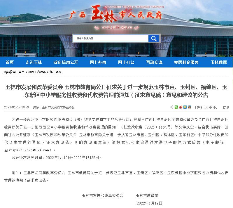 小编21日从玉林市人民政府网站获悉,为进一步规范中小学服务性收费和代收费,维护学校和学生的合法权益,市发改委和市教育局现公开征求关于进一步规范玉林市直、玉州区、福绵区、玉东新区中小学服务性收费和代收费管理意见和建议。