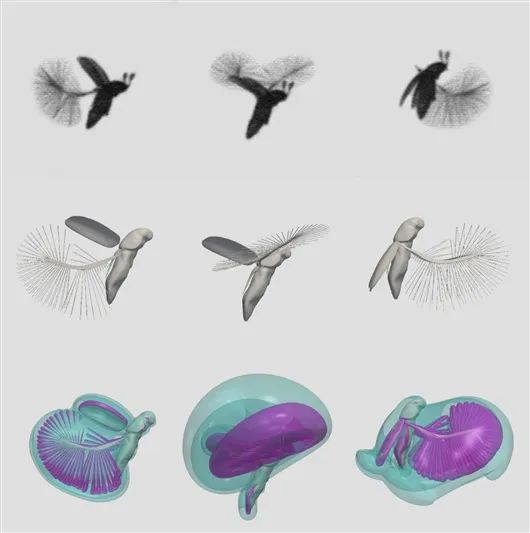 飞行中的缨甲Paratuposa placentis(上)、其翅膀运动的3D重建(中)和气流的可视化(下)。图片来源:施普林格·自然