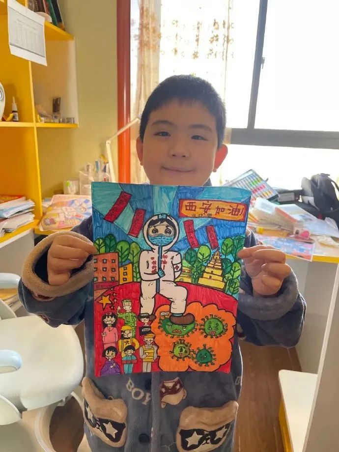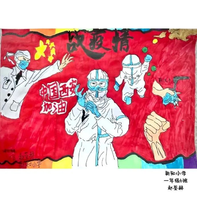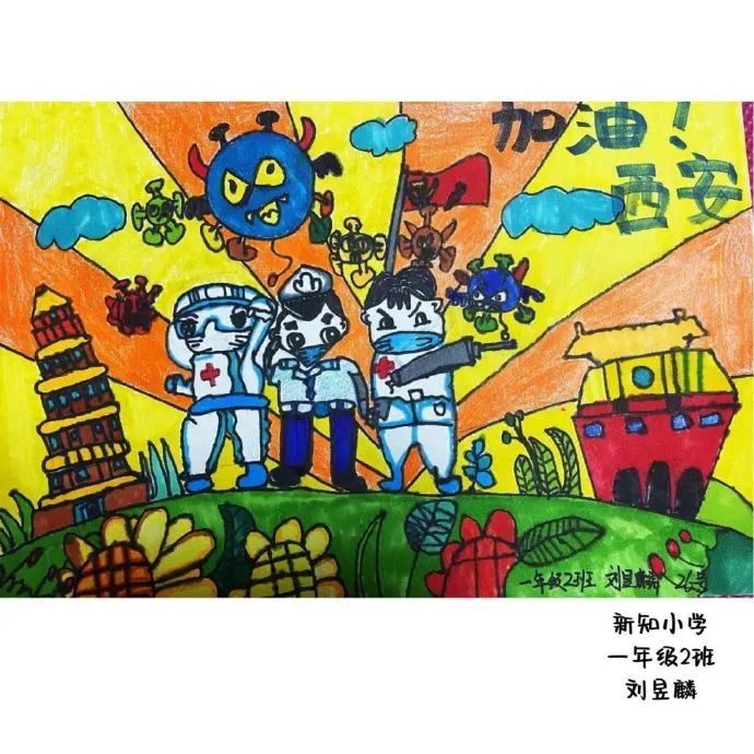 西安新知小学的孩子们拿起自己手中的画笔,画出了这场“全民战疫”中,每一个热爱祖国、热爱这片土地、热爱生命的最美的样子。他们创作出了一幅幅描绘全民抗击新型冠状病毒、致敬一线抗疫工作者的作品,共同表达爱的力量!