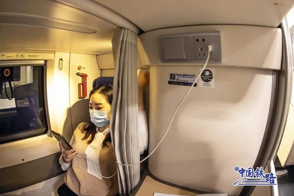 包厢设计比照航空商务舱,脚下与旁边铺位头部空间共享,可大幅提高空间利用效率。铺位窗帘边缘装有4块吸铁石,能与包厢两侧墙壁严密贴合,旅客可享受独立单间。此外,列车进一步优化了减振降噪设计,使旅客的睡眠环境更加舒适。