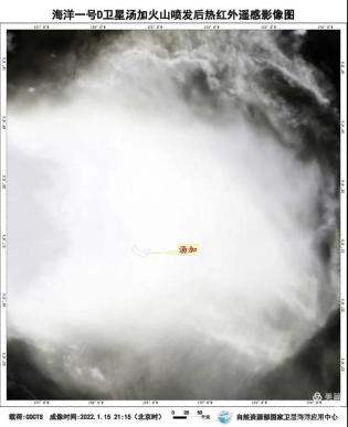 △汤加火山喷发9小时后,海洋一号D卫星获得的热红外遥感影像图