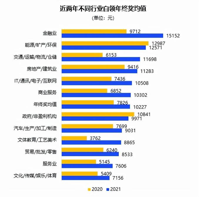 调研数据显示,2021年全国白领年终奖平均值为10227元,较2020年的7826元同比增长30.7%。