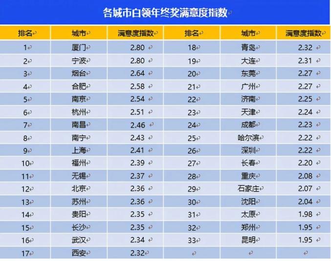 从不同城市来看,对年终奖最满意的城市为厦门、宁波,满意度指数均为2.80,厦门连续两年排名第一。其次是烟台、合肥、南京,一线城市中,仅上海进入满意度前十。