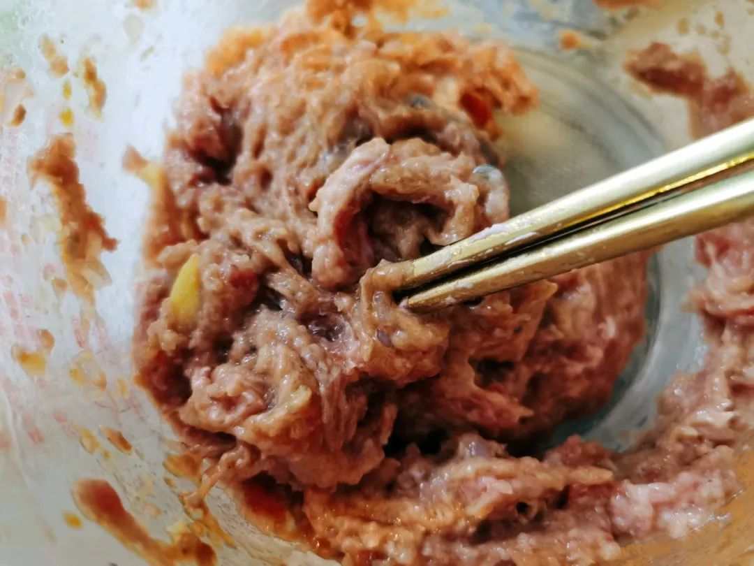 2.鲜虾仁和猪肉里加入蚝油、生抽、食盐、白砂糖、姜末、胡椒粉,打成虾泥,留几段虾仁,一会混合包进去,这样口感更丰富。