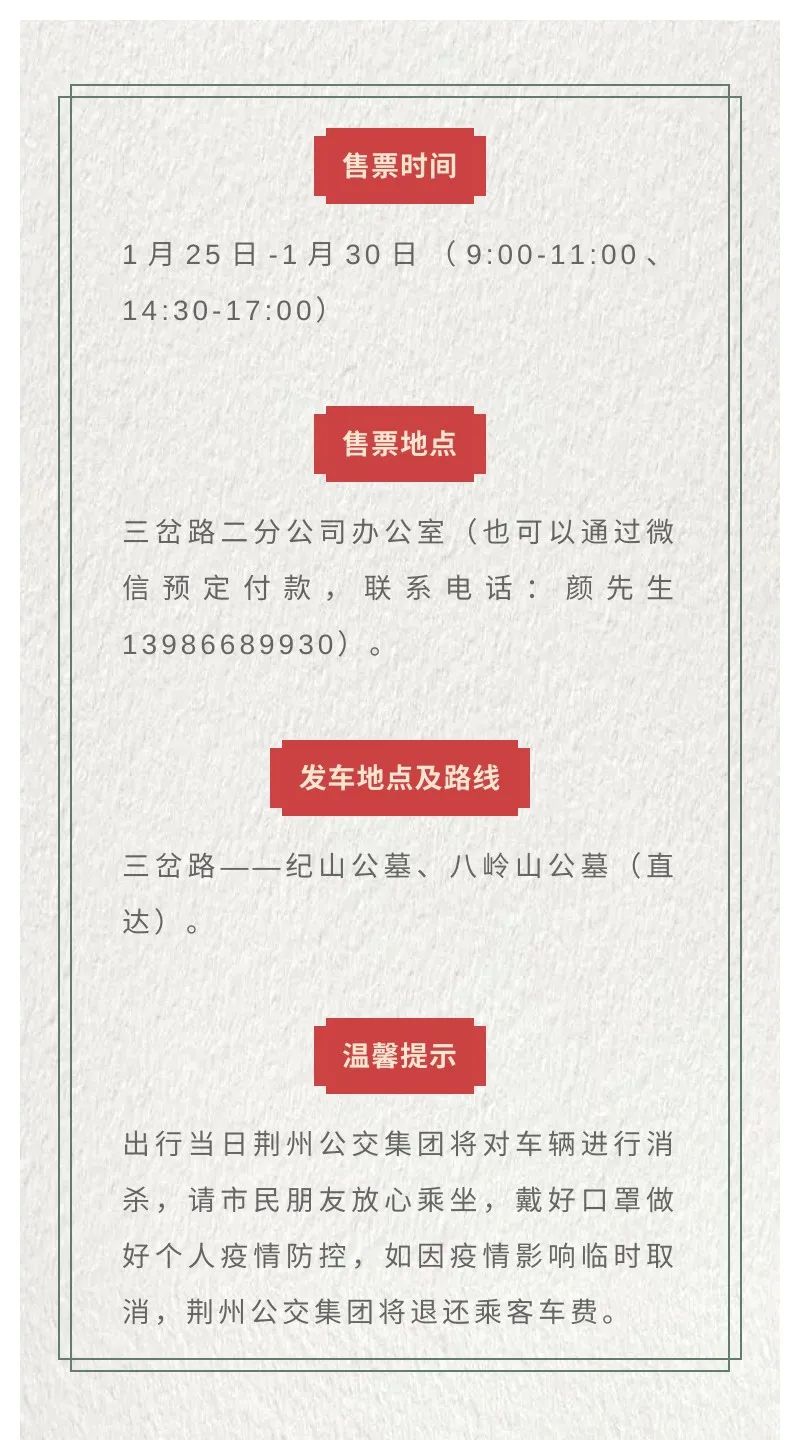 ▲为满足市民祭扫出行需求,在壬寅虎年春节来临之际,荆州公交集团二分公司于2022年1月31日(除夕)-2月2日开通三天纪山和八岭山扫墓专线车。