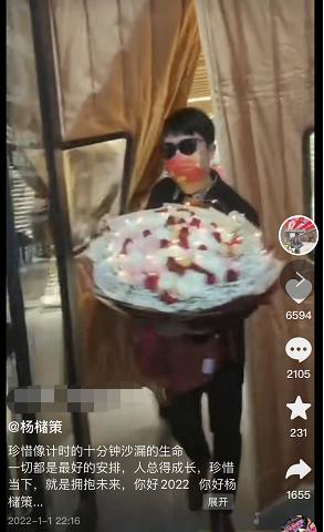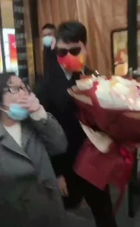 视频里,他戴着墨镜,蒙着口罩,抱着一束玫瑰,从一个类似酒店的地方走出。走向门外的余秀华。