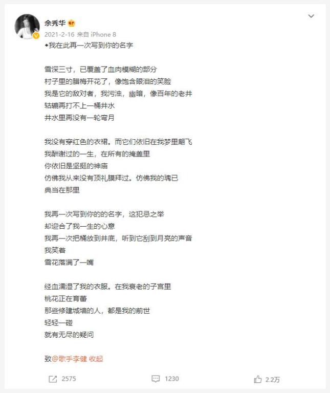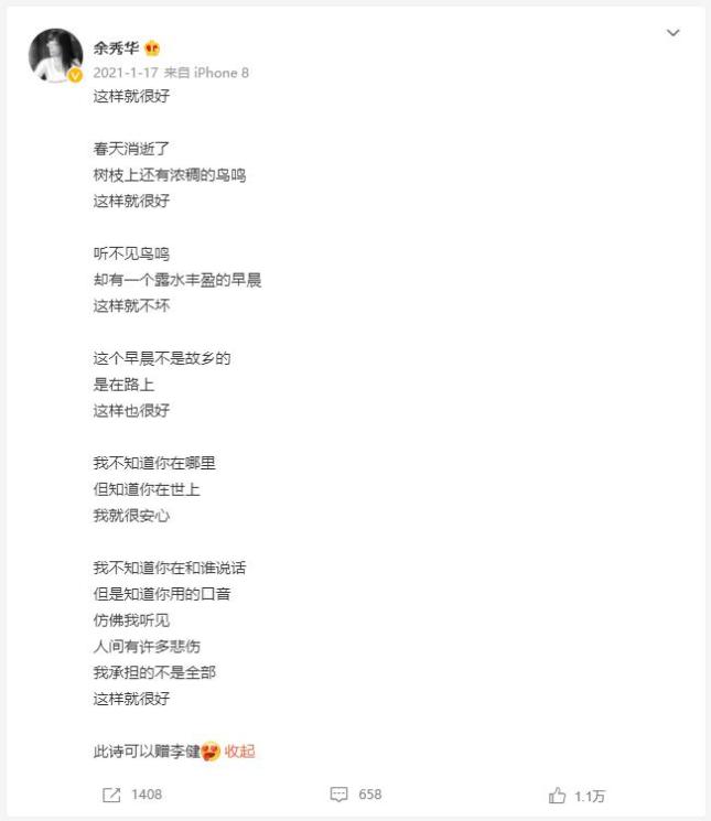 在2021年的最后一天,她在自己的公号上发了一首诗。
