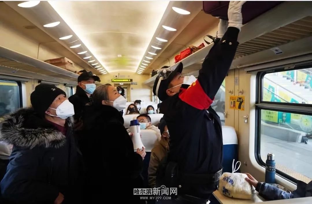 车厢里热闹非凡,大家都被这个操着蹩脚东北口音的河南小伙逗得开怀大笑。车厢里这个手持扩音喇叭的乘警正在以“我为家乡代言”为题,介绍着作为冰雪运动大省--黑龙江冰雪健儿在历次冬奥会中的骄人战绩,语言不失诙谐幽默,欢笑声不绝于耳,年味也被衬托得越发浓郁了。