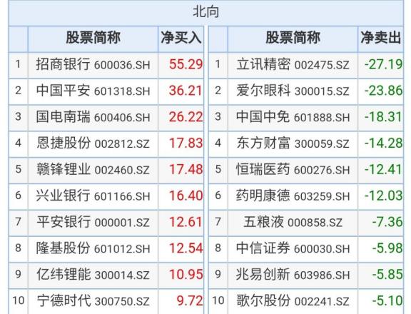 从近一个月北向资金十大活跃个股成交及资金流向角度看,招商银行净买入额55亿元居首,中国平安和国电南瑞净买入额分别为36亿元和26亿元位列二三。立讯精密近一个月北向资金净卖出额27亿元位列榜首,爱尔眼科和中国中免净卖出额分别为23亿元和18亿元排名二三。