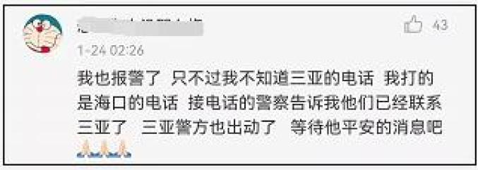 1月24日上午,三亚后海派出所一位值班人员表示,凌晨曾接到过有关刘学州轻生的报警电话,值班民警有出警,目前刘学州应该在301医院,其他情况并不清楚。