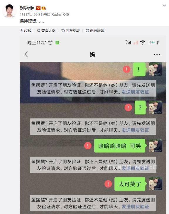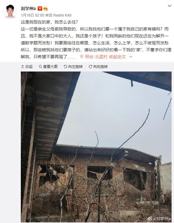 去年12月和今年1月,刘学州与自己的亲生父母分别相认,他还在自己的社交平台上晒出了认亲现场的照片。但1月18日凌晨,刘学州通过自己的社交平台发声,称自己被生母拉黑。(此前报道:与亲生父母团聚不到1个月,寻亲男孩称遭母亲拉黑:因住房问题产生分歧)