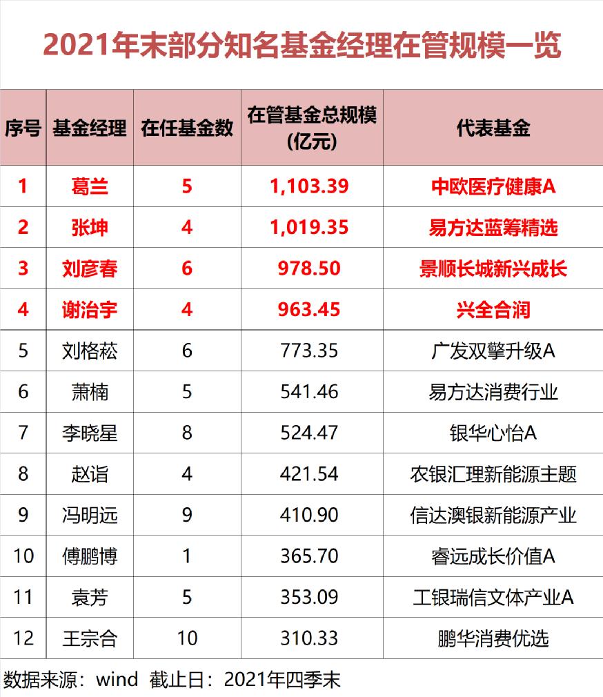 从最新的规模排名看,葛兰超越张坤,在管基金规模1103亿元,成为在管规模最大的主动基金经理;张坤位列其次,四季度险守1000亿大关。刘彦春、谢治宇紧随其后,管理规模都超过960亿元,经过去年市场风格的快速轮动和变化,市场知名基金经理管理规模发生了“大洗牌”。