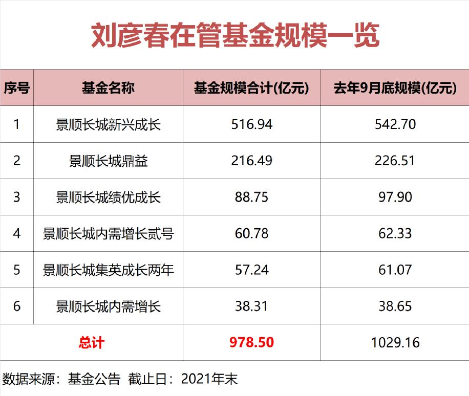 截至2021年四季报,刘彦春在管基金总规模为978.5亿元,跌破千亿关口。他在2021最后一份季报中提到,“投资最困难的阶段已经过去,保持耐心,价值总会回归。”