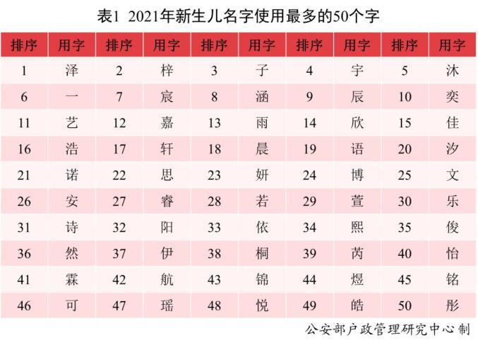 2021年出生并已经进行户籍登记的新生儿名字中,使用频率最高的50个字依次为泽、梓、子、宇、沐等。与2020年相比,汐、芮、霖、航等字受到青睐。