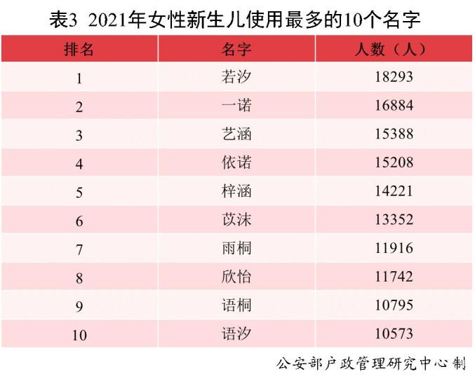 2021年出生并已经进行户籍登记的女性新生儿中,使用频率最高的10个名字依次为:若汐、一诺、艺涵、依诺、梓涵、苡沫、雨桐、欣怡、语桐、语汐。与2020年相比,若汐、艺涵、苡沫首次进入前十,其中“若汐”使用人数达到1.8万,登顶榜首,成为女性新生儿名字首选。