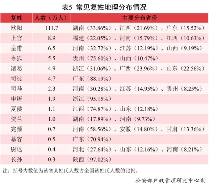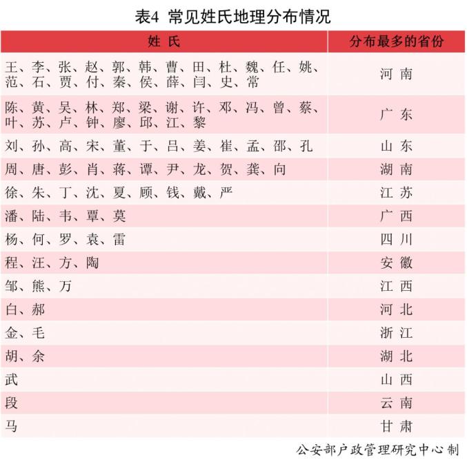从整体分布看,常见姓氏分布广泛,在全国31个省(区、市)均有分布,但同时也存在一定的空间聚集性。王、李、张等二十二个姓氏人口分布最多的省份是河南;陈、黄、吴等二十个姓氏人口分布最多的省份是广东;刘、孙、高等十二个姓氏人口分布最多的省份是山东;周、唐、彭等十一个姓氏人口分布最多的省份是湖南;徐、朱、丁等九个姓氏人口分布最多的省份是江苏;潘、陆、韦等五个姓氏人口分布最多的省份是广西;杨、何、罗等五个姓氏人口分布最多的省份是四川;程、汪、方等四个姓氏人口分布最多的省份是安徽;邹、熊、万三个姓氏人口分布最多的省份是江西;白、郝两个姓氏人口分布最多的省份是河北;金、毛两个姓氏人口分布最多的省份是浙江;胡、余两个姓氏人口分布最多的省份是湖北;武姓、段姓、马姓人口分布最多的省份分别是山西、云南和甘肃。