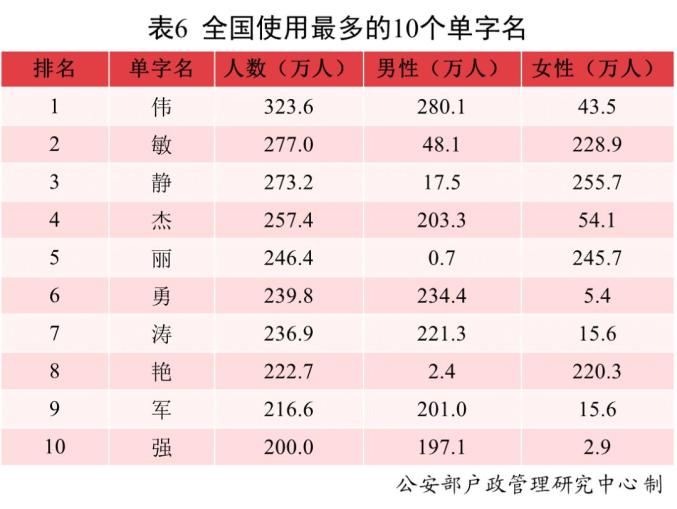 全国户籍人口中,使用频率最高的10个单字名依次为:伟、敏、静、杰、丽、勇、涛、艳、军、强。其中“伟”名列榜首,使用人数为323.6万。男性使用较多的单字名为伟、杰、勇、涛、军、强;女性使用较多的单字名为敏、静、丽、艳。