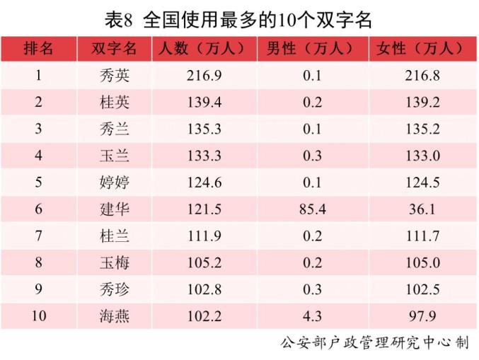 全国户籍人口中,使用频率最高的10个双字名依次为:秀英、桂英、秀兰、玉兰、婷婷、建华、桂兰、玉梅、秀珍、海燕。其中“秀英”名列榜首,使用人数为216.9万。男性使用较多的双字名仅有“建华”;其余常见双字名为女性使用较多,重名率明显高于男性。