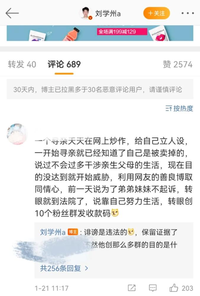 记者注意到,1月21日,曾有网友在刘学州的微博评论区留言质疑刘学州,称刘学州是在利用寻亲给自己炒作、立人设,刘学州的行为是利用网友的善良博取同情心。对此,刘学州在微博评论留言称,“诽谤是违法的,保留证据了”。