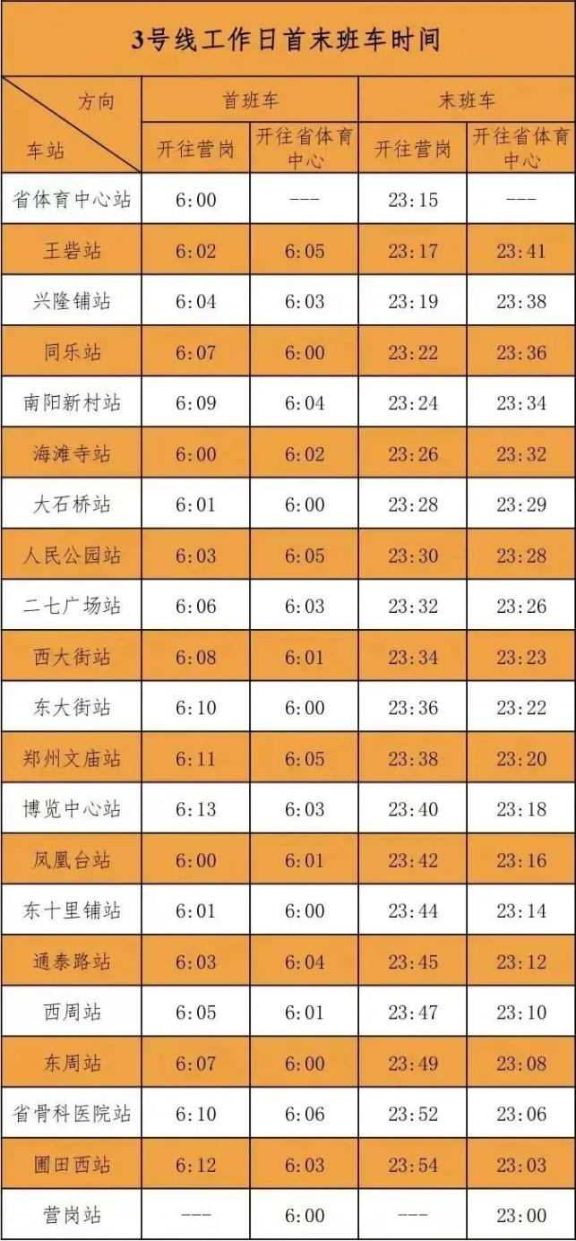 自2022年1月24日起,郑州中建深铁3号线工作日高峰期行车间隔调整为6分30秒,平峰期行车间隔调整为8分钟。调整后的工作日首末班车发车时间见下表。
