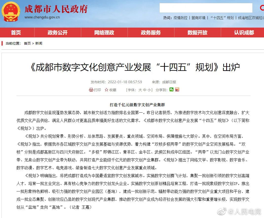 原标题:《人民电竞周报|《成都市数字文化创意产业发展“十四五”规划》出炉;微软以690亿美元收购动视暴雪》
