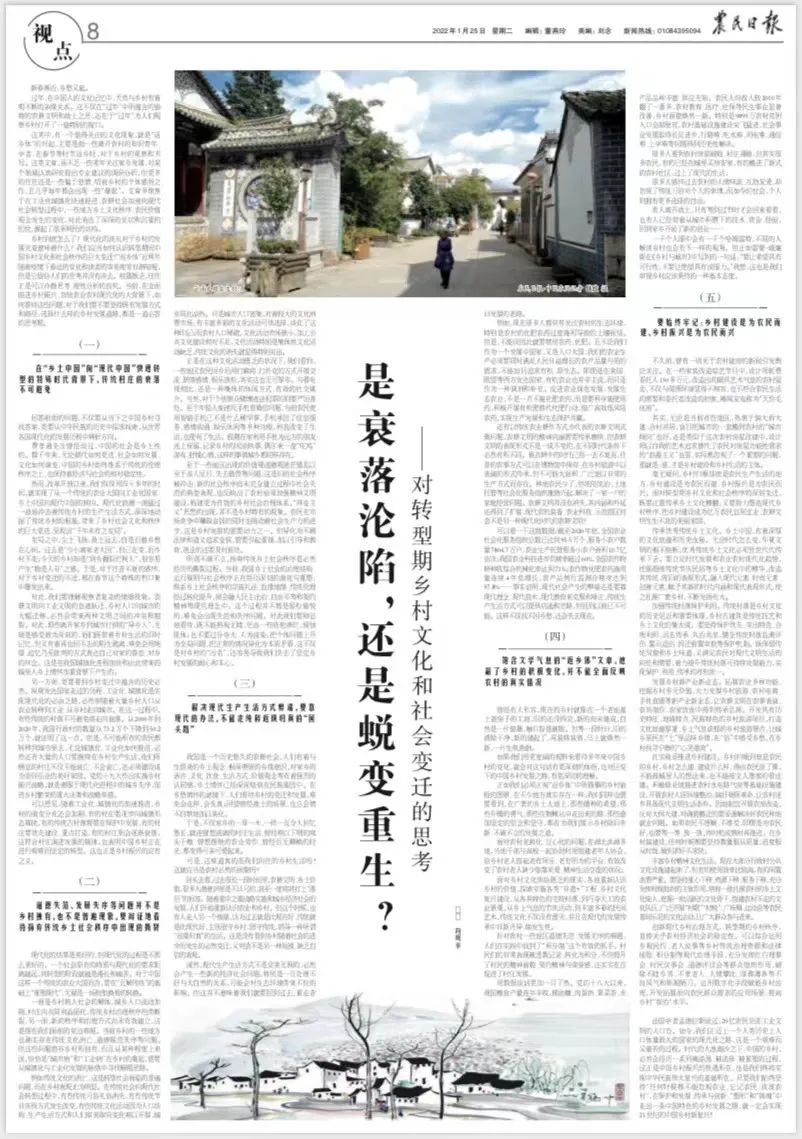 这其中,有一个值得关注的文化现象,就是“返乡体”的兴起,主要是指一些离开农村的知识青年、学者,在春节等时节返乡时,对于乡村的观察和书写。这类文章,虽不乏一些常年关注家乡发展,对某个领域认真研究提出专业建议的调研分析,但更多的往往还是一些偏于悲情、唱衰乡村的个体感悟之作,且几乎每年都会出现一些“爆款”。文章多聚焦于在工业化城镇化快速推进、农耕社会加速向现代社会转型过程中,一些地方乡土文化秩序、农民价值观念发生的变化,对此表达了深深的关切和沉重的担忧,激起了很多网民的共鸣。