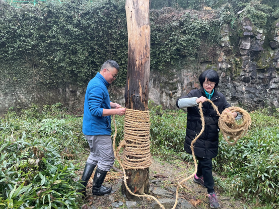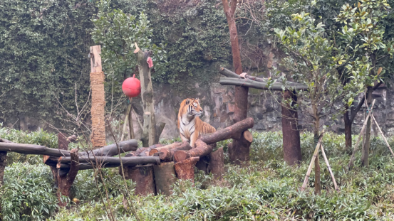 可躺、可卧、可跳跃的豪华栖架床,迎合了虎王磨爪、啃咬的生活习性,新的一年里后花园的日子变得丰富多彩;柔软的垫料池,既能提供保暖的休息场所,也能寻找食物,延长采食时间、增加采食乐趣;新架起来的木桩,是保育员们充分利用园区的园林废弃物打造的新玩具,虎山的主人们貌似兴趣颇深,没事就去晃一晃,蹭蹭痒。春节来拜年的游客们,可要仔细瞅瞅这些新家具哦!