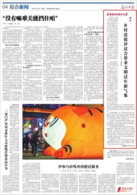 “过节不忘抗疫。有了村里道德评议会的柔性劝导,对于文明过年的一些举措,村民们更能理解和接受,效果很好。”树下村相关负责人告诉记者,为了让文明过年的观念深入人心,村里还组建了移风易俗宣讲队,由村里德高望重的老人组成,以福清方言的形式,将移风易俗、文明过年的内容编写成打油诗,在村里开展接地气的宣传宣讲,赢得村民交口称赞。