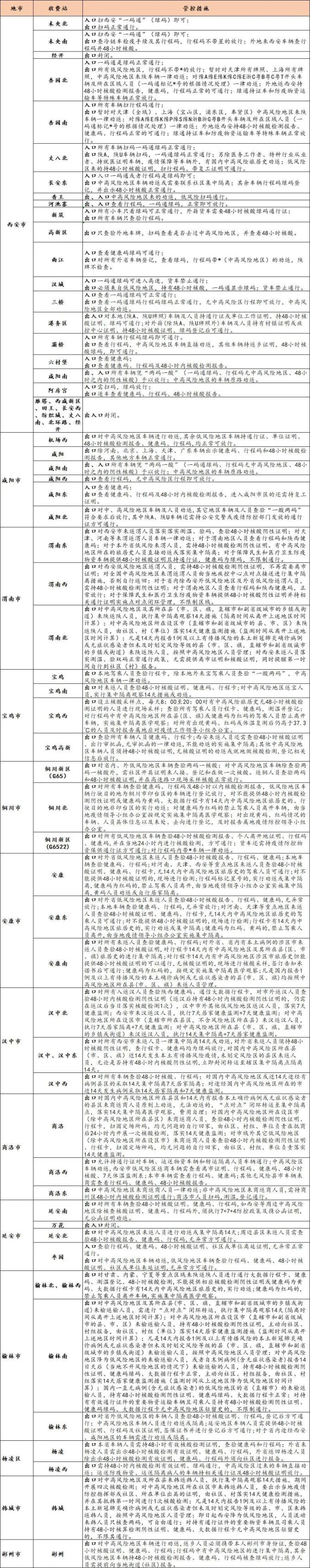 10.包茂高速西富段:泾阳收费站出入口解除封闭。入口陕西牌照小型客车直接通行,大型客车、货车及外地所有客货车需在防控点登记领票方可通行;出口对中高风险地区、河南、天津所有车辆禁止通行, 客车持48小时核酸证明、行程码、泾河新城区域返乡证明可通行,货车查看48小时核酸证明、行程码、西安市防疫指挥部通行证或者单位来人接可通行。铜川新区收费站出口对有出行证明的西安等地来铜人员一律查验两码和48小时核酸证明,并在出口再做一次核酸正常放行;对没有出行证明的铜川籍返铜人员查验两码和48小时核酸证明,在高速路口现场采样,由所在区县单位点对点接回,落实相关管控措施;对其他地区中转西安返铜人员查验两码和48小时核酸证明,并在高速路口现场采样核酸正常放行。铜川北收费站出口对所有车辆查验健康码、行程码及48小时以内核酸检测报告,货车需提供疫情防控车辆通行证或民生保供企业通行证件,对货车能够提供车辆通行证件和48小时内核酸阴性证明且健康码为绿码、大数据行程卡无14天内中高风险地区旅居史的驾乘人员自由通行,对不能提供48小时内核酸检测阴性证明或健康码为黄码、大数据行程卡有14天内中高风险地区旅居史的、客车行驶目的地非印台区、货车无车辆通行证件的实行劝返;对健康码为红码的禁止驾乘人员离开车辆,由当地疫情领导小组办公室按规定实施集中隔离医学观察,对出现黄码、红码情况的车辆、人员具体信息以及来处、去向进行登记,及时报告属地疫情防控领导小组办公室。泾河新城收费站对省外低风险地区来人来车查验健康码、行程码及48小时内核酸检测正常即放行;省内地区来人来车查验健康码、行程码正常即可放行;中高风险地区物资保障车辆,确需进入泾河新城内,先消杀,查验48小时核酸检测阴性报告,健康码、行程码正常,点对点行业部门对接贴封条落实无接触管理,卸完货即离开。玉华宫收费站出口对所有车辆查验健康码、行程码及48小时以内核酸检测报告,无核酸检测报告及河南、西安、上海、天津籍车辆一律劝返,针对健康码“红码”、“黄码”、大数据行程卡带“*”号人员,立即就地留观,联系所在区县联防联控指挥部办公室“点对点”转运做好分类管控。黄陵西收费站出口对从天津全域和河南、广东、上海、浙江、西安等中高风险地区(含国务院客户端动态调整公布的区城)返黄人员原则上劝返,因特殊情况确需来返人员需提前3天向所在单位、村组、社区报备,随后立即赋红码,,严格执行14天集中隔离医学观察措施;对中高风险地区所在地市其他区域来返人员,赋黄码,严格落实“7+7”管控措施;低风险地区来返人员应加强健康监测,当日、第4天各做一次核酸检测。三原出口对所有车辆查看两码和48小时核酸证明,所有货车持三原疫情办的通行证可以通行,小客车返回三原需提前三天网上注册报备,审核通过后方可通行,中高风险地区劝返。