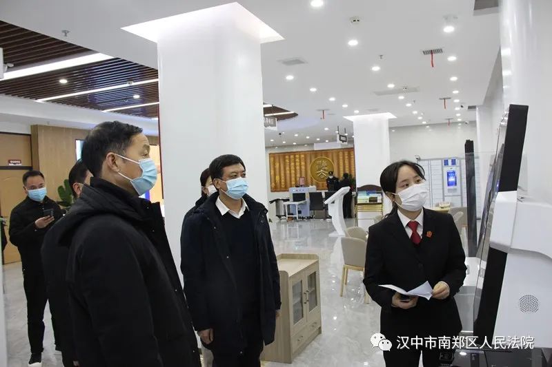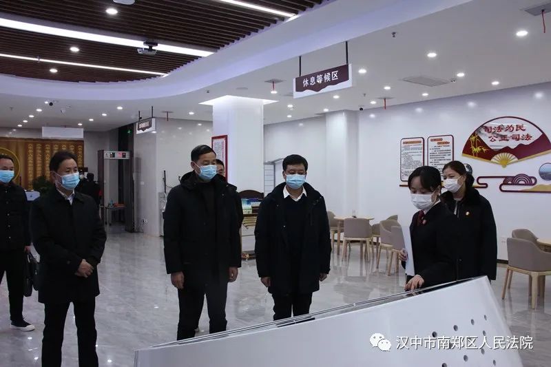 张犇明副书记一行参观了南郑法院法治文化长廊、诉讼服务大厅、云上法庭、远程视频调解室等场所。在工作人员的介绍下,张书记对诉讼服务大厅的区域划分、硬件、软件的具体功能及使用情况进行了解。随后,工作人员向张书记一行演示了通过诉讼服务远程柜台机、自助查询一体机、诉状生成一体机等智能设备进行自助立案、网上立案、跨域立案等功能和流程操作方法。最后,张书记一行来到诉调对接中心,在驻院调解员张吉林的介绍下,了解南郑法院诉前调解案件工作情况。