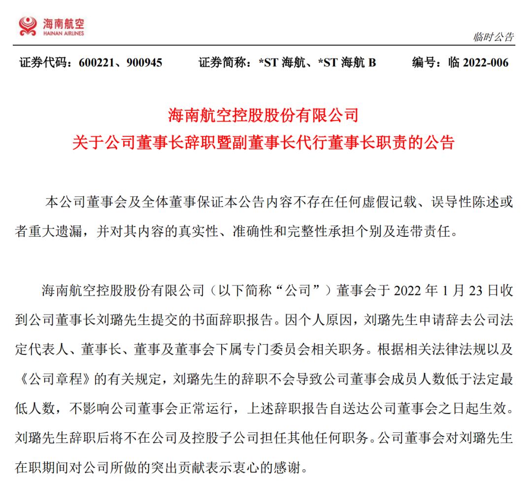 值得注意的是就在1月24日晚间,海南航空控股股份有限公司发布人事变动公告。公告中称,公司董事会于2022年1月23日收到公司董事长刘璐提交的书面辞职报告。因个人原因,刘璐申请辞去公司法定代表人、董事长、董事及董事会下属专门委员会相关职务。