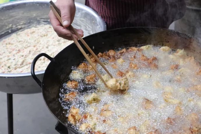今天,首先炸的是丸子。王大姐说:“想要丸子好吃,馅儿好是关键。肉还得选这个肥瘦相间的猪前腿肉,在剁好的肉馅里放上面粉、姜末、味精、盐、花椒水,再打上几个鸡蛋,搅拌均匀后,用手汆成大小差不多的丸子,在油七成热的时候下锅,炸到金黄色,就可以出锅了。”