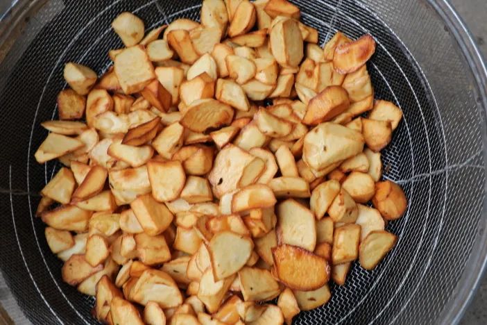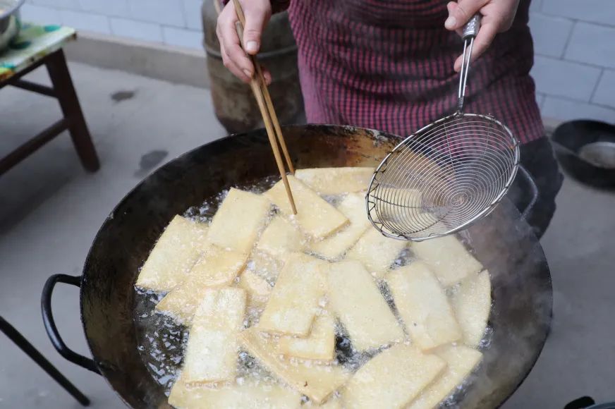 而除了炸丸子,炸豆腐、炸土豆也是过年必不可少的一项小食。“以前过年炸的豆腐都是自己做,炸好后各家各户送点。现在大家生活条件好了,能吃的菜品也多了,每样东西也就少准备点,仪式感一定要有。”王大姐说。