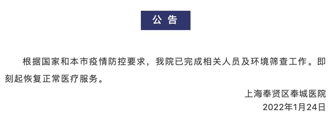 1月24日早上六点半,上海市奉贤区奉城医院完成相关人员及环境筛查工作,院内滞留人员陆续离开。1月24日早上八点整点,奉城医院全面恢复门急诊、住院等日常医疗业务。