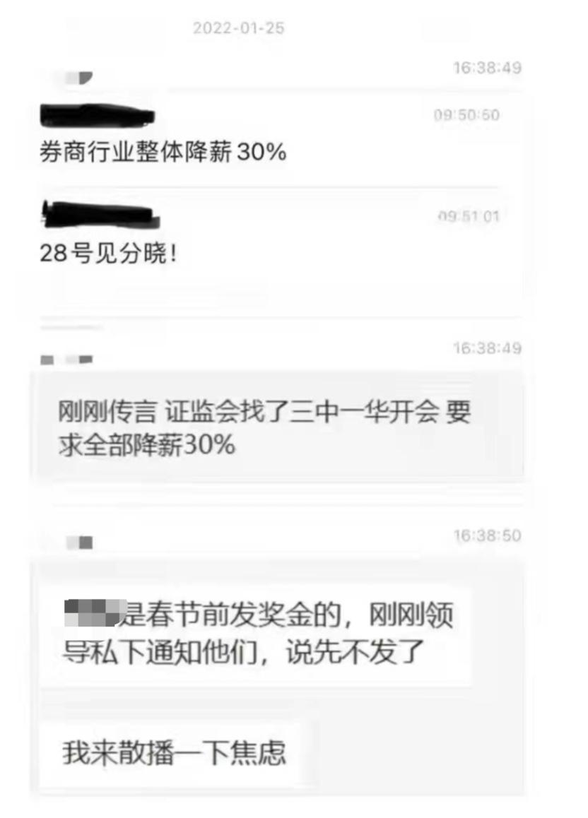 近日网传“证券行业整体降薪30%,28号见分晓”“证监会找三中一华开会,要求全部降薪30%”。新年以来,上述证券业降薪言论愈演愈烈,甚至具体到个别公司已采取行动,网传“某券商春节前(暂)不发放奖金”。
