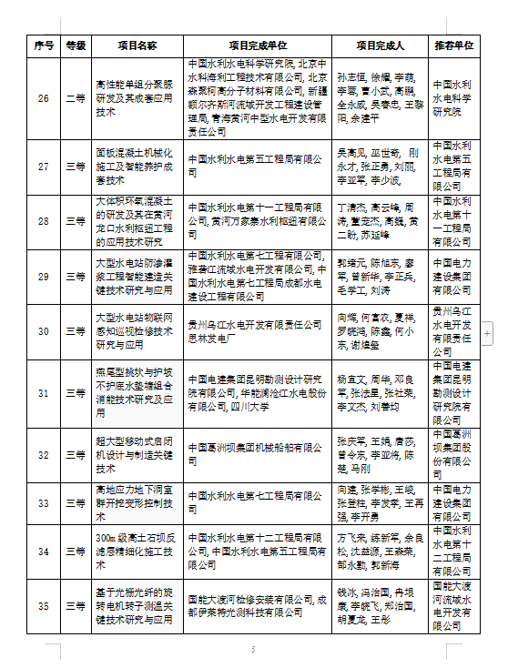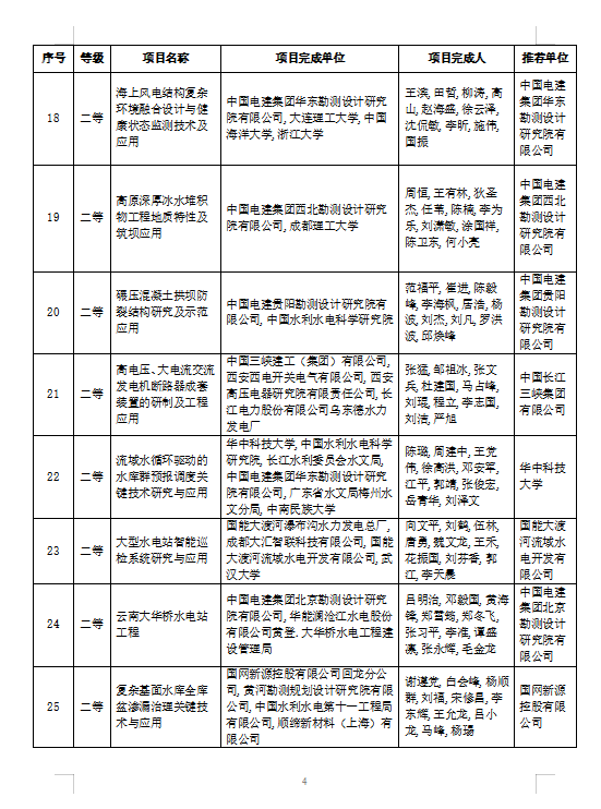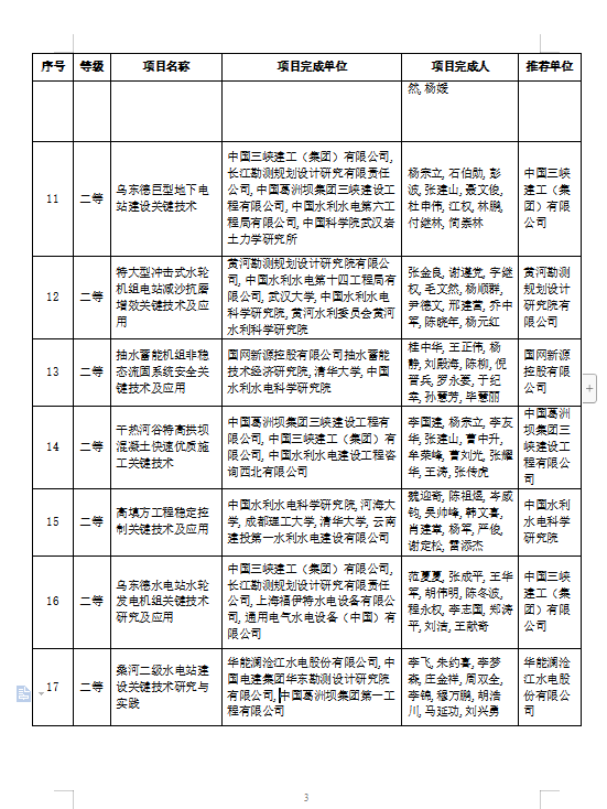 其中,“金沙江向家坝水电站工程”1项成果获特等奖,“HydroBIM-数字设计、智能建造和智慧运营研究及应用”“河渠冰情监测预报与冰凌灾害防治关键技术装备”等9项成果获一等奖,“乌东德巨型地下电站建设关键技术”“特大型冲击式水轮机组电站减沙抗磨增效关键技术及应用”等16项成果获二等奖,“面板混凝土机械化施工及智能养护成套技术”“大体积环氧混凝土的研发及其在黄河龙口水利枢纽工程的应用技术研究”等27项成果获三等奖。