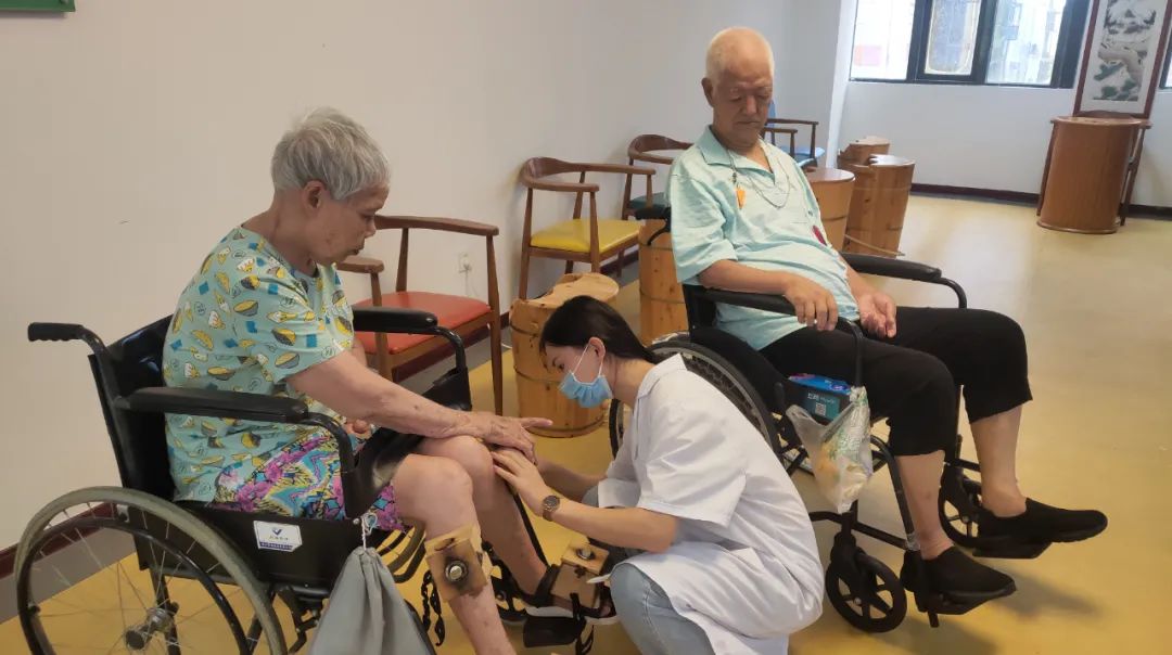 一进门,赵海霞便熟练地搀扶着老人在轮椅上坐下,一边聊着家常一边为老人盖上厚毯子,然后用艾灸棒开始为老人理疗。